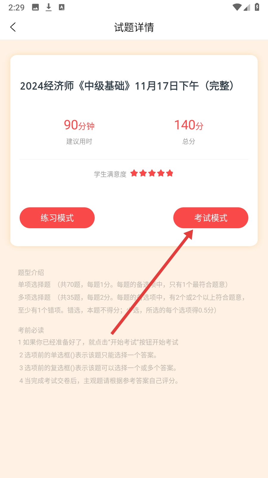 在试题详情页点击【考试模式】按钮,即可进入考试模式页面。