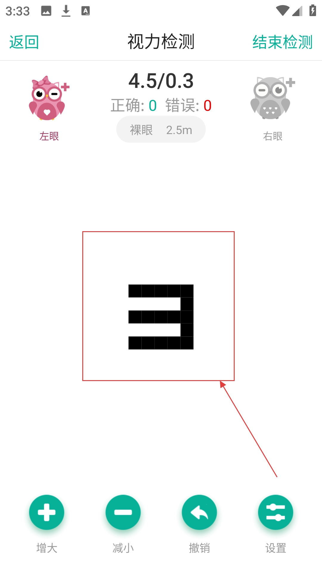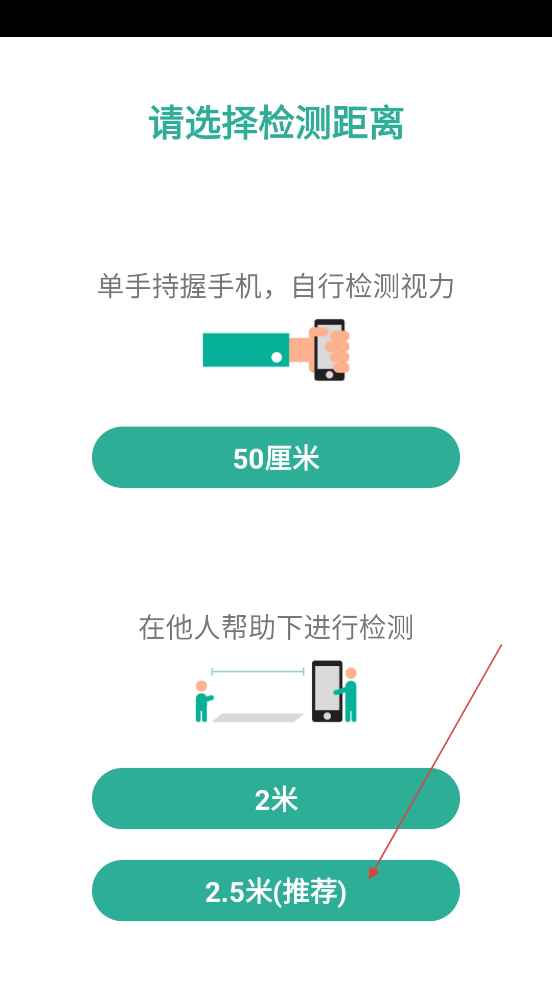在检测距离选择界面,点击【2.5米(推荐)】这一选项,即可进入视力检测页面。