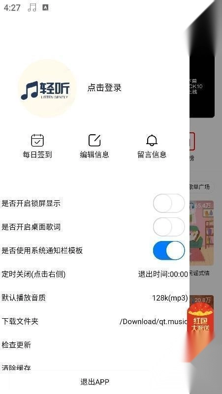 4、点击左上角的功能栏,我们可以设定锁屏显示、桌面歌词、定时关闭、播放音质选择、文件夹选择等功能。