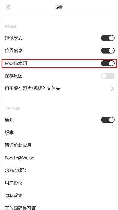 3、往下拉找到foodie水印功能,默认是开启的。