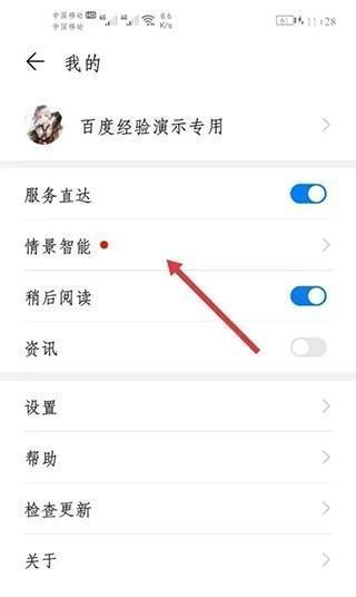 2、进入手机个人页面,点击情景智能。