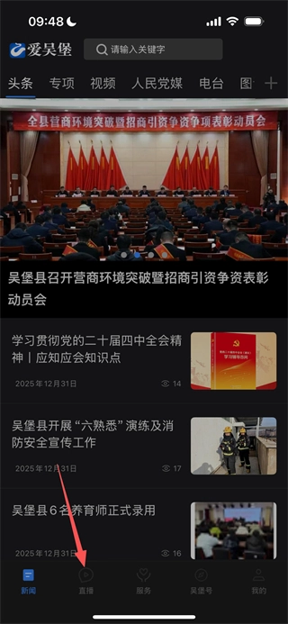进入爱吴堡后,点击底部的直播选项,就能进入直播页面。