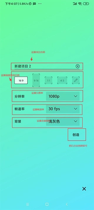 3、可以设置项目名称、宽高比例、分辨率、帧速率、背景颜色;