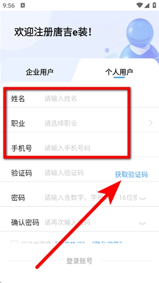 在个人用户注册页面,先输入姓名,接着输入手机号,然后点击“获取验证码”按钮。