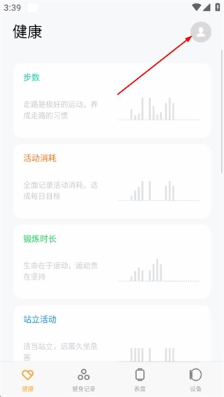 进入魅族穿戴应用后,点击界面右上角的头像图标,即可进入个人信息页面。