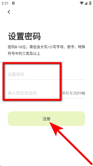 在密码设置页面完成密码设置,输入短信收到的验证码后点击注册,即可完成账号创建流程。