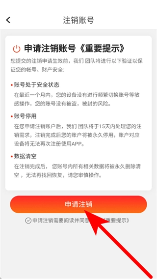 在注销账号页面,阅读页面内容,点击申请注销。