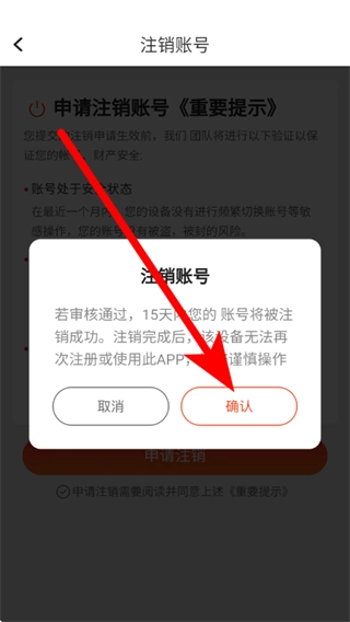 当弹出注销账号的确认弹窗时,点击确认按钮,即可提交注销申请。
