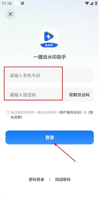 在登录界面输入手机号与验证码,勾选相关协议后,点击登录按钮即可完成账号登录流程。