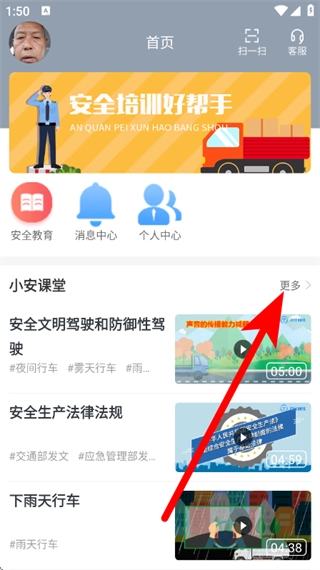 在晋交安培首页,找到小安课堂板块,点击其右侧的“更多”按钮,即可进入内容列表页面。