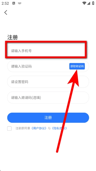 在注册界面,输入手机号,点击获取验证码。