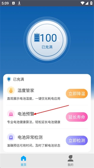 在应用的首页,点击电池预警区域,即可进入电池检测页面。