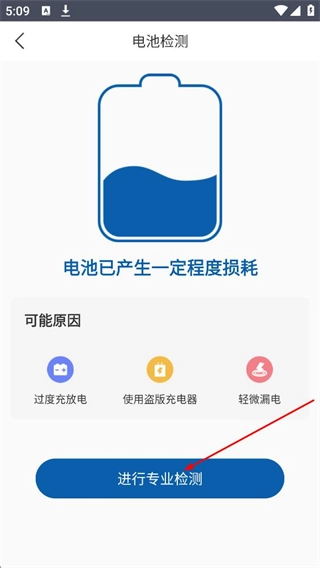 在电池检测页面,点击“进行专业检测”按钮,即可进入电池健康详情页面。