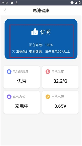 在电池健康页面,可查看电池健康度、电池温度等状态信息,从而了解电池当前的情况。