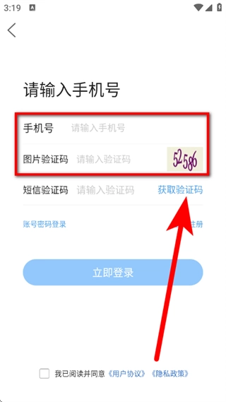 在登录界面,输入手机号,点击获取验证码。