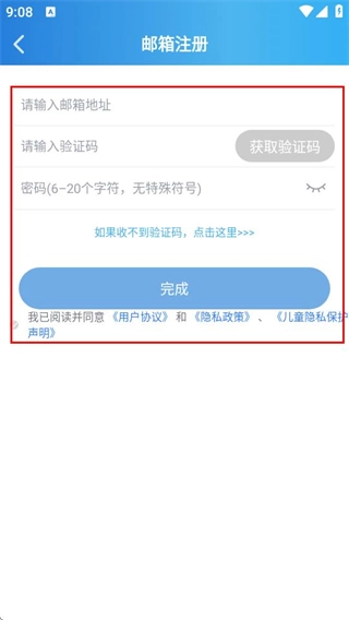 在邮箱注册页面填写相关信息并勾选协议后,点击完成按钮即可完成注册流程。