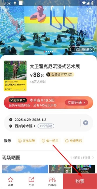 在展览详情页面找到购票按钮并点击,随后完成该展览的购票流程。