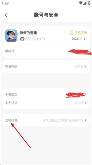 在账号与安全页面点击注销账号,即可进入风险提示页面。