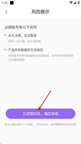 在风险提示页面点击“已清楚风险”并确认继续,即可完成账号注销操作。