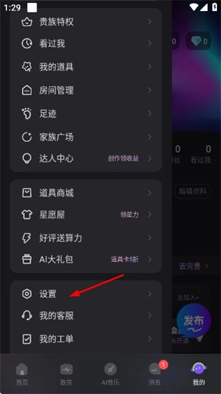 在我的页面点击左上角的菜单按钮,展开功能列表。
