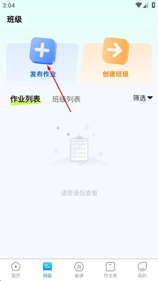 在班级页面,点击发布作业选项,进入作业类型选择页面。