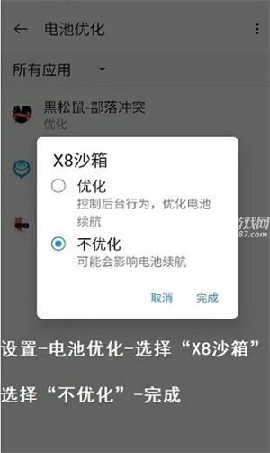1、设置——电池——电池优化,选择“X8沙箱”——不优化;在任务栏中,锁定”X8沙箱”的应用;