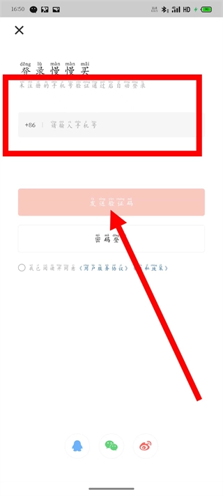 在登录页面,输入手机号码,点击发送验证码。