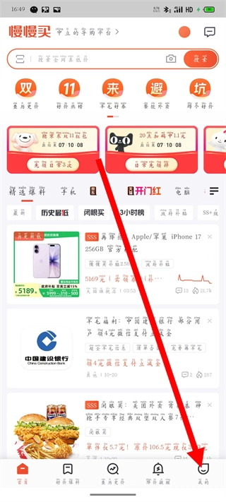 打开慢慢买,点击底部导航栏最右侧的我的。
