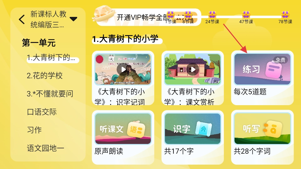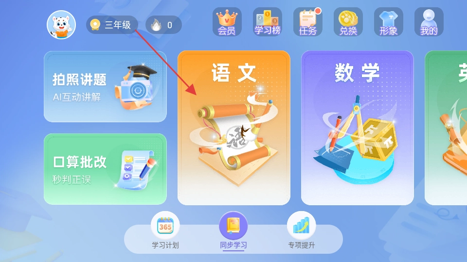 打开小学宝,在首页点击语文,进入语文学习页面。