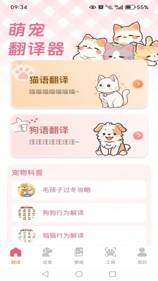 在翻译页面,这里支持猫语和狗语的翻译功能,同时还提供相关的科普知识。