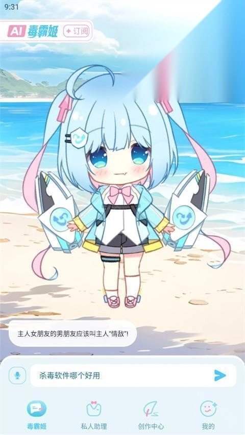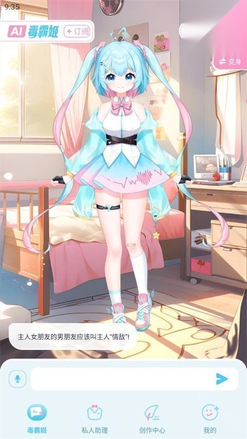 4、首页第一个角色就是毒霸姬,点击进去后,选择变身或者更换背景,也可以在输入框中输入内容进行互动。