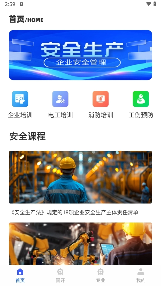 首页展示企业培训、电工培训、消费培训、工伤预防等相关教学视频,帮助用户熟悉培训内容,提前做好预防;同时还提供各类整理好的安全课程,可供直接免费学习。