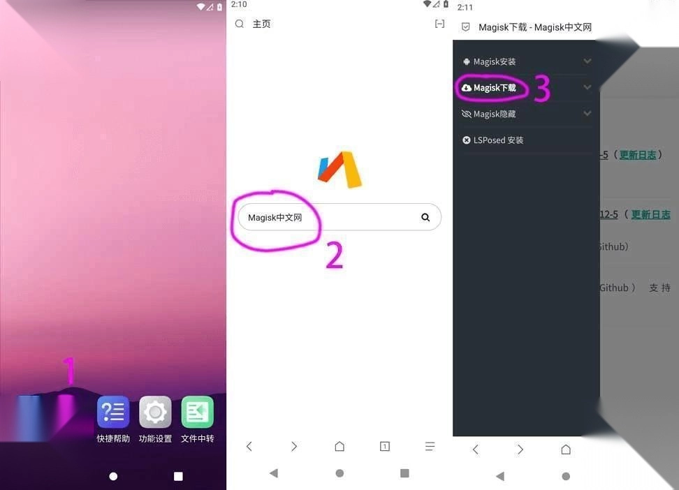 3、打开Via浏览器,搜索“Magisk中文网”,找到稳定版Magisk后进行安装。