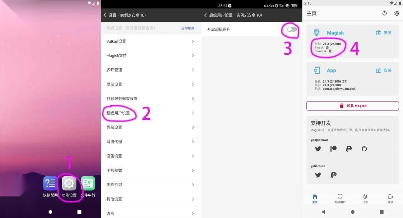 2、功能配置 – 超级用户配置(启用)- Magisk支持(启用)- Vulkan配置(启用)