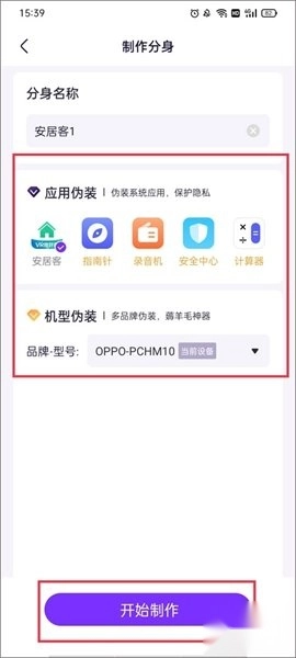 3、输入分身的名称,并选择是进行应用伪装还是机型伪装,选择完毕后点击“开始制作”即可。