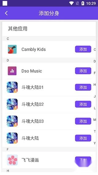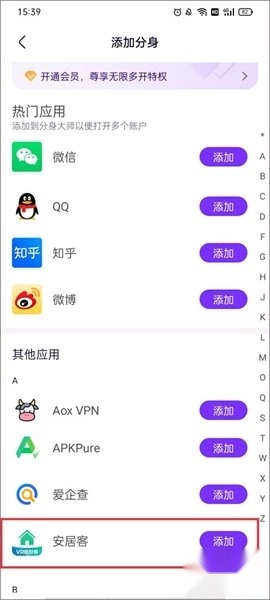 2、在应用列表中选择你想要添加分身的应用程序,并点击右侧的添加按钮。