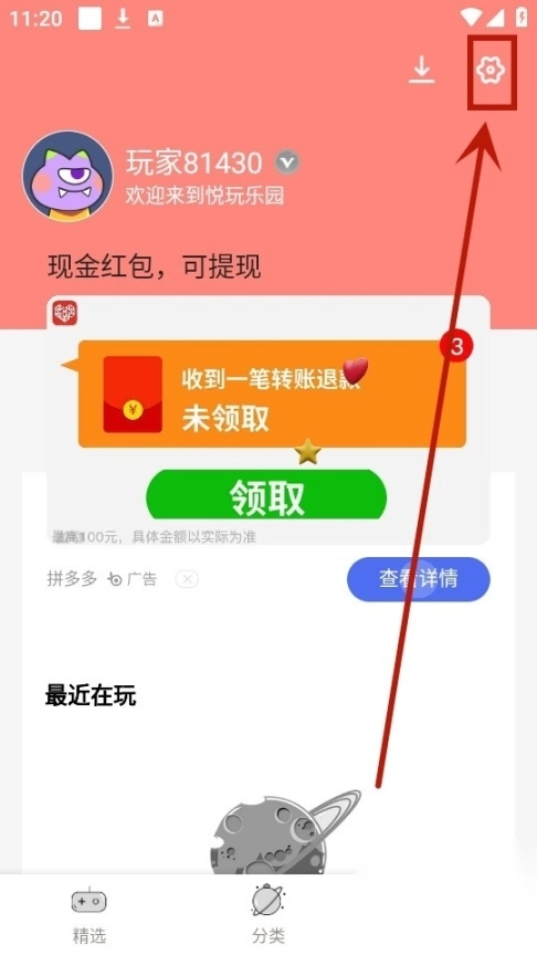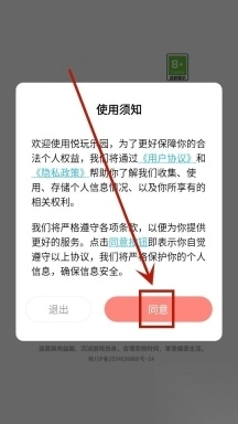 首先安装悦玩乐园应用,安装完成后打开它,接着点击“同意”按钮以确认同意相关的隐私政策。