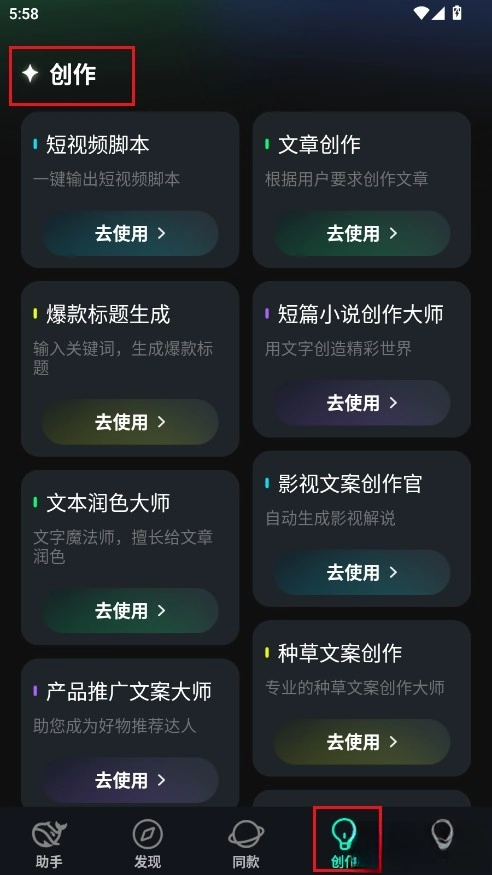 在创作页面,我们为大家准备了适用于不同场景的创作功能,点击进入即可使用。