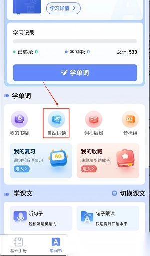 2. 每日使用自然拼读模块跟读三遍,点击录音回放对比真人发音进行校准。