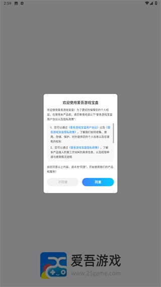 1、阅读完爱吾游戏宝盒用户协议以及隐私政策后,点击同意即可进入软件;