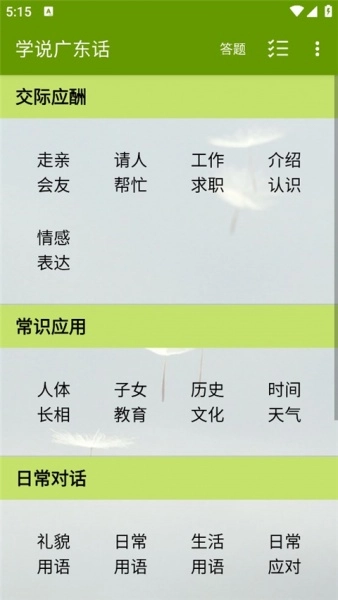 学说广东话是一款专为粤语学习而打造的实用工具。它以简单明了的教程帮助用户轻松掌握粤语发音与用法,无需繁琐的记忆与文书工作。软件内含多种实际场景模拟,让学习过程更贴近生活,提升语言运用能力。用户可以随时点击播放语音,自动缓存后便于离线反复听,充分利用空闲时间进行学习。还具备录音功能,可以自我检测发音,以便及时纠正错误。不管是在广州、香港等地旅行,还是在日常交流中,这款软件都能助你一臂之力,快速提升粤语水平,让语言变得更加自信自然。