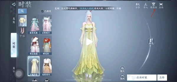 在时装界面,找到已获得的时装并选中,点击“应用时装”按钮就能完成更换,另外也可以通过点击“上传”按钮来分享该时装。