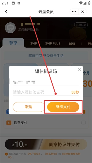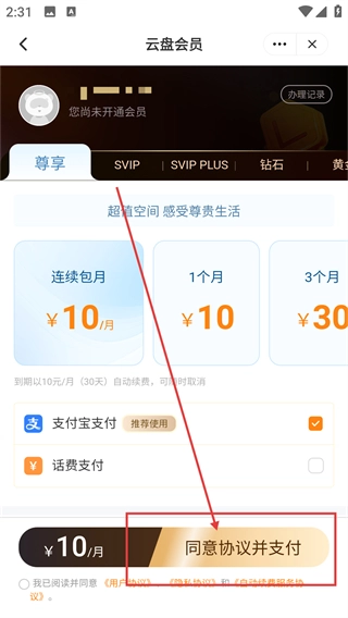 在云盘会员页面选定套餐后,勾选相关协议并点击【同意协议并支付】按钮,即可进入支付环节。
