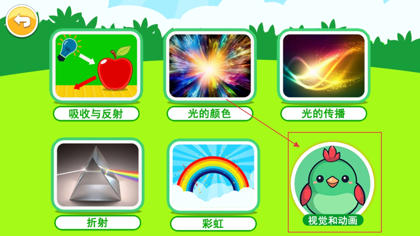 打开应用后,首页设有【吸收与反射】【光的颜色】【光的传播】【折射】【彩虹】【视觉和动画】等光学知识板块,接着点击【视觉和动画】。