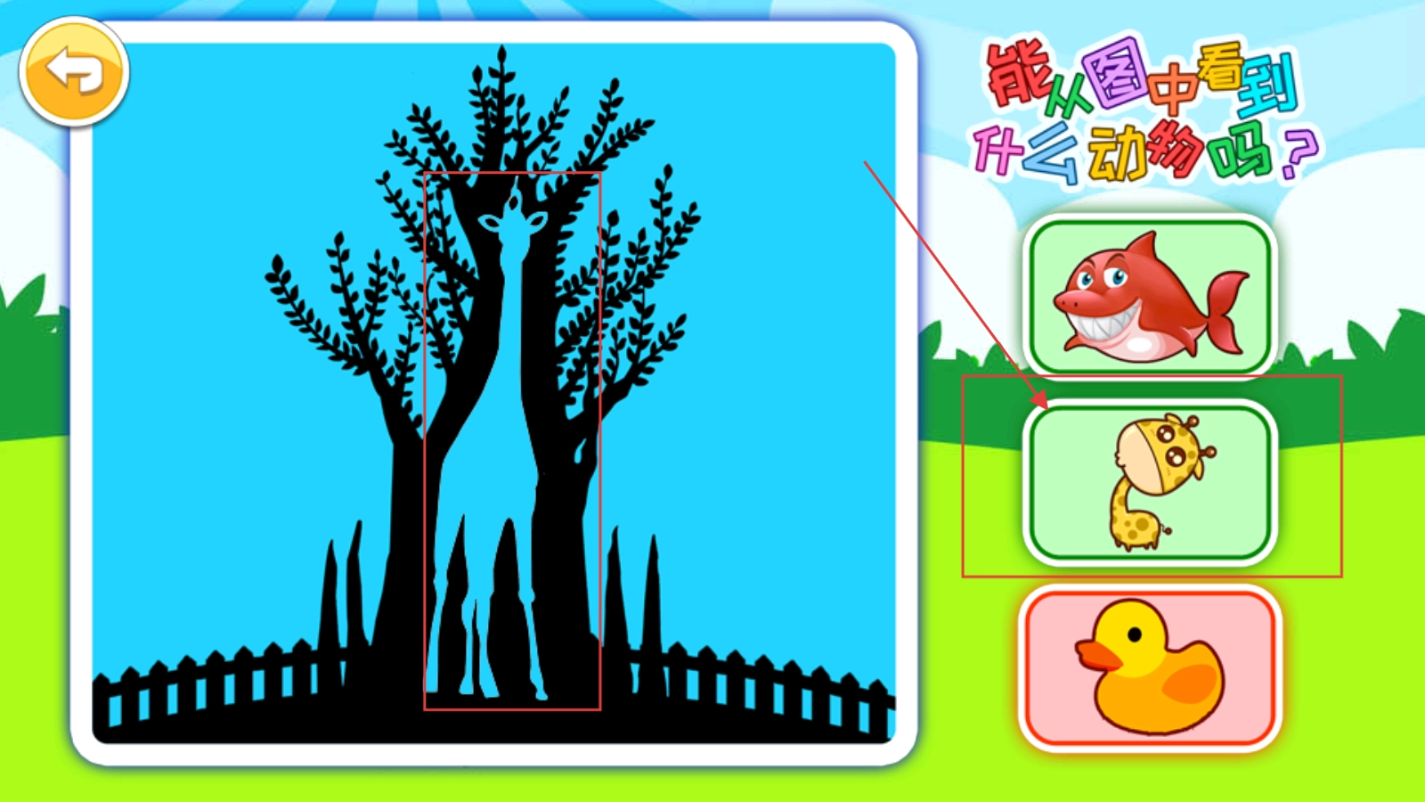 进入图案详情页面后,按照提示“能从图中看到什么动物吗?”仔细观察图里的动物(比如【长颈鹿】的剪影图),然后点击右侧对应的动物选项,就能完成这次互动啦。