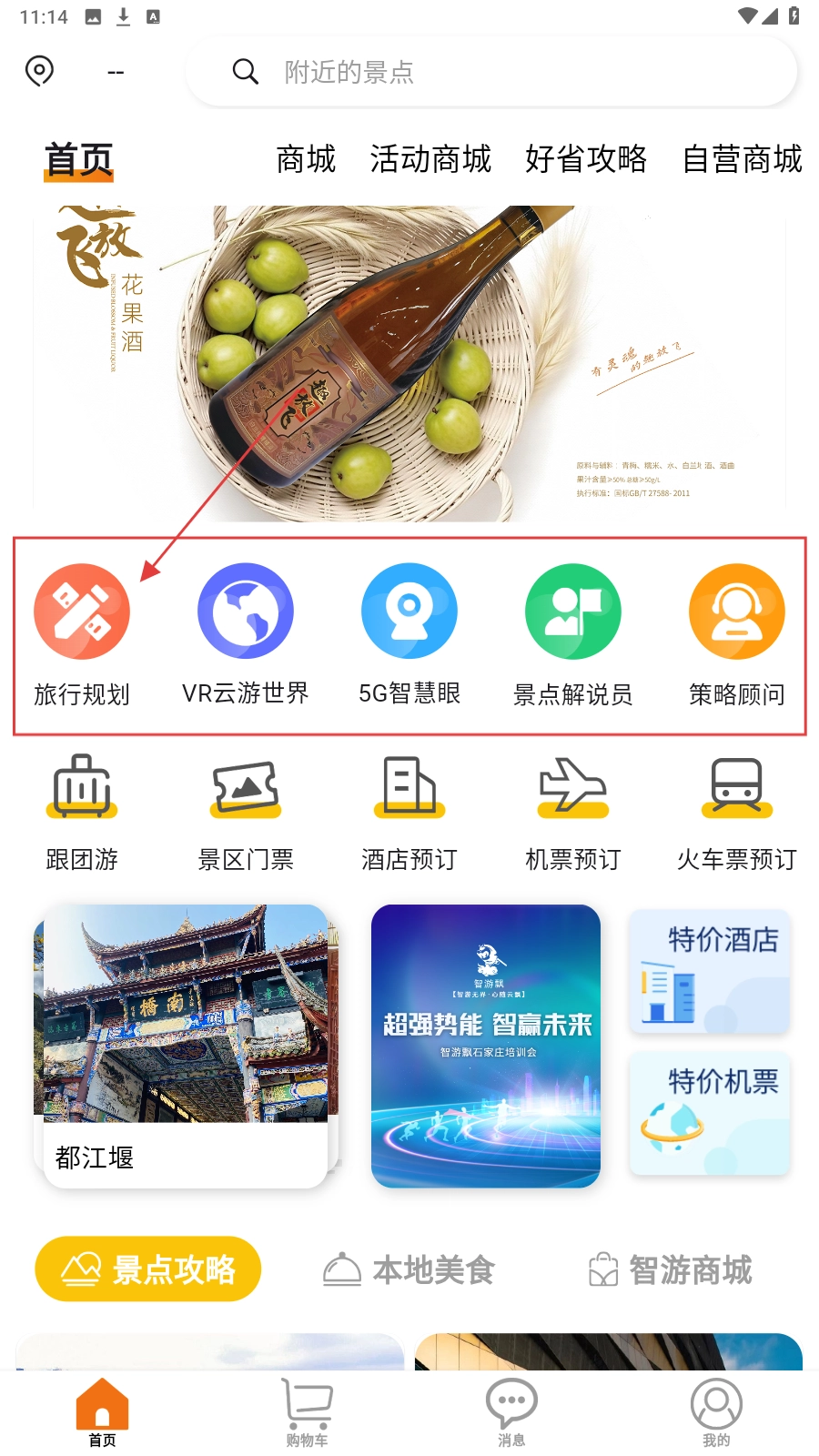 打开应用后,在【首页】界面能看到旅行规划、VR云游世界等功能按钮,你可以根据自己的需求进行选择,比如点击【旅行规划】按钮。