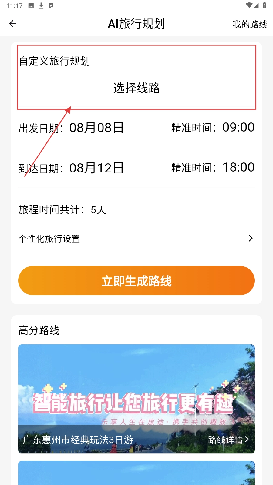 在【AI旅行规划】页面,点击【选择线路】按钮。