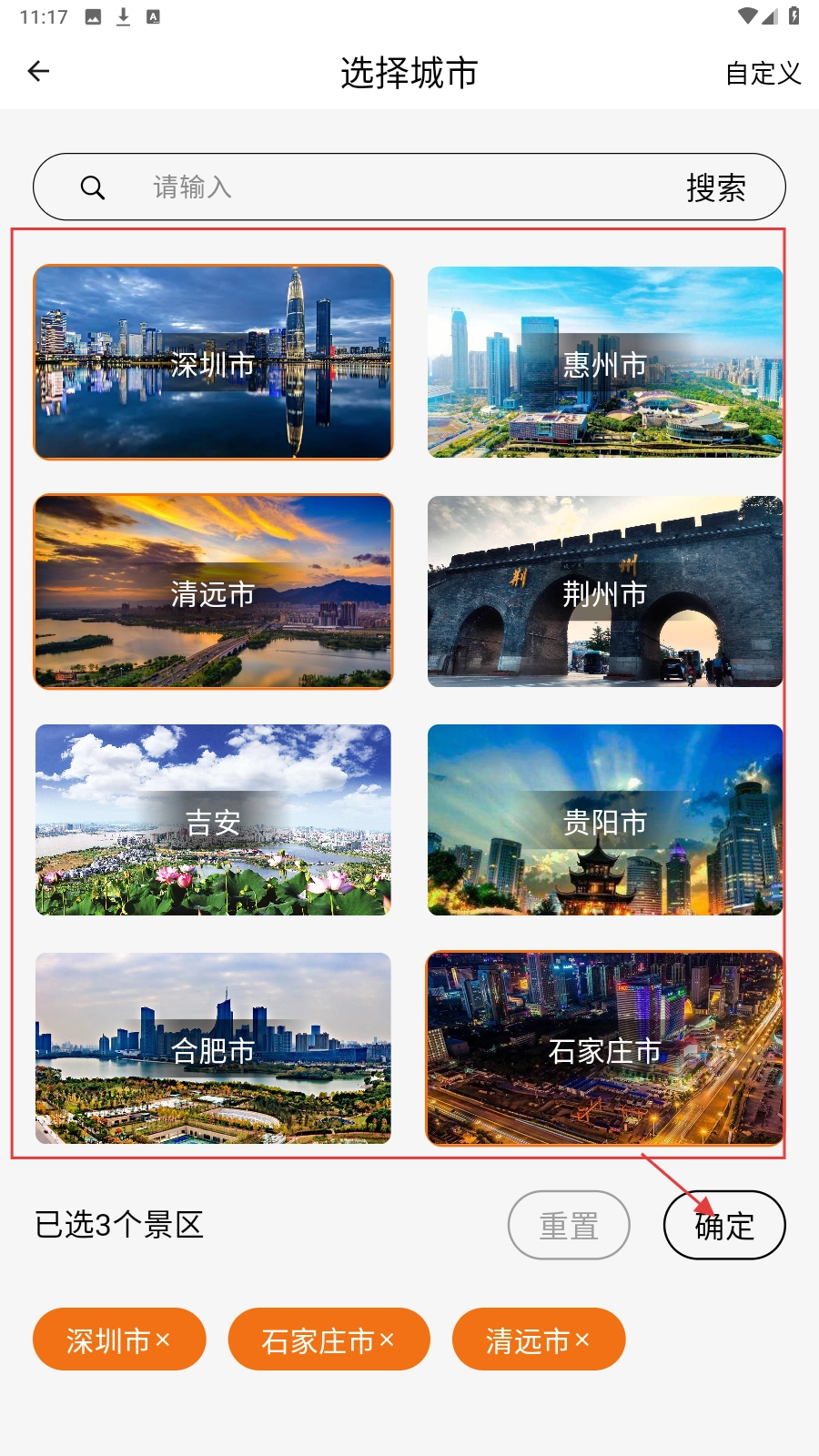 进入【选择城市】界面,选定计划前往的旅游城市,确认选择后点击【确定】按钮。