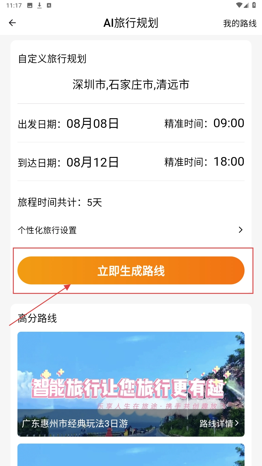 确认行程信息后,点击【立即生成路线】按钮,即可获取旅行规划。