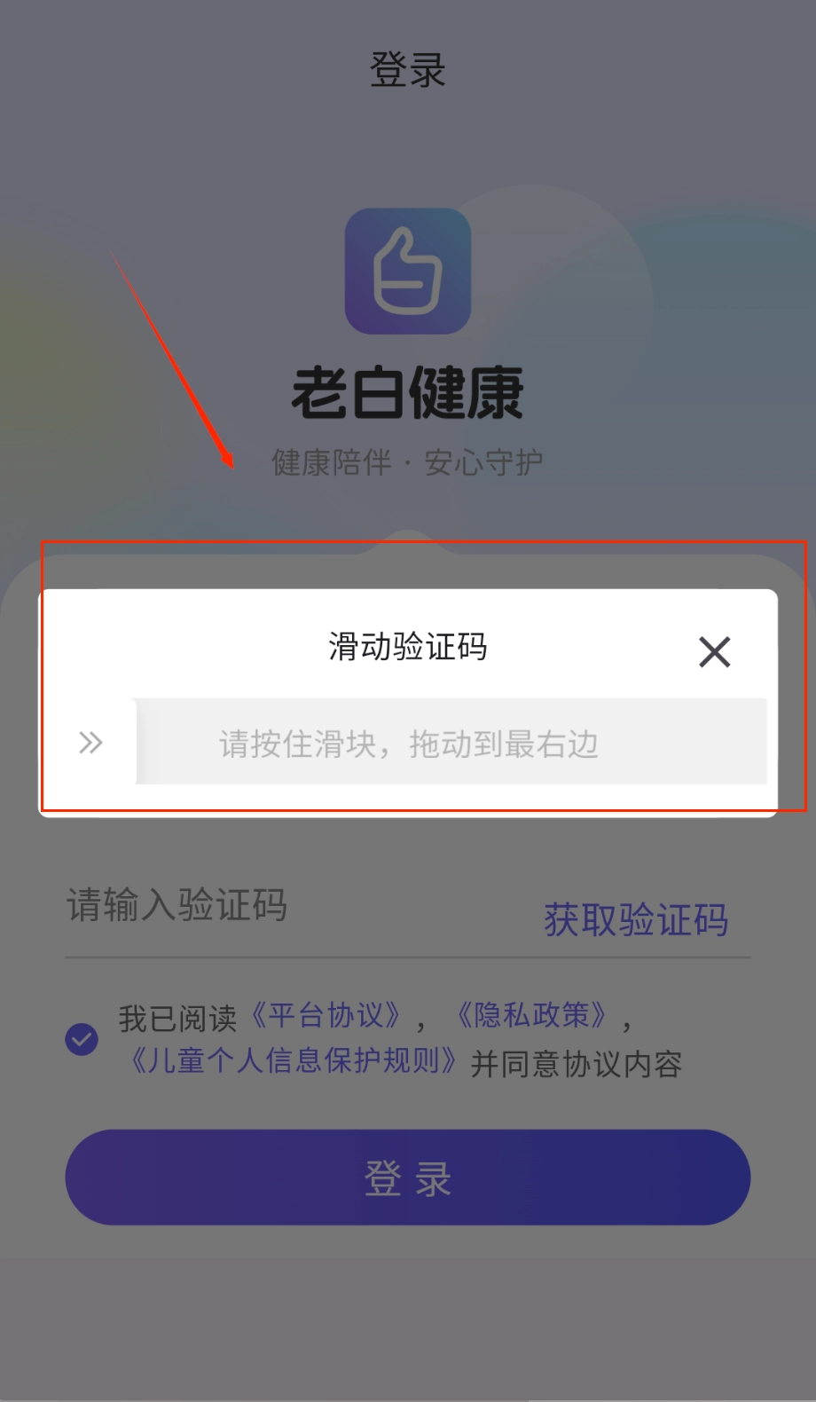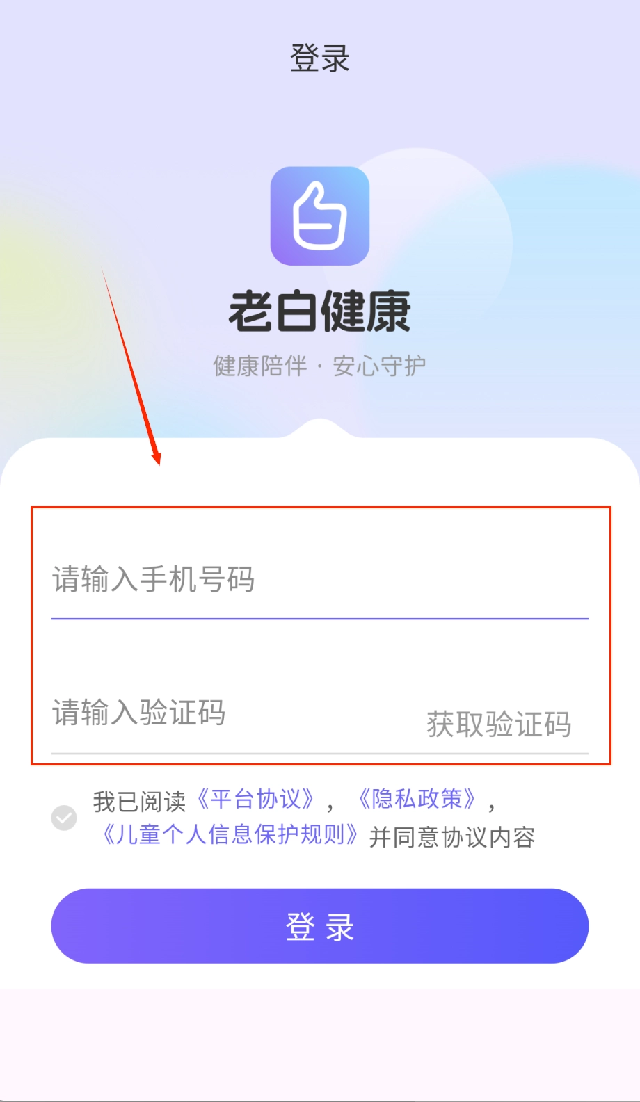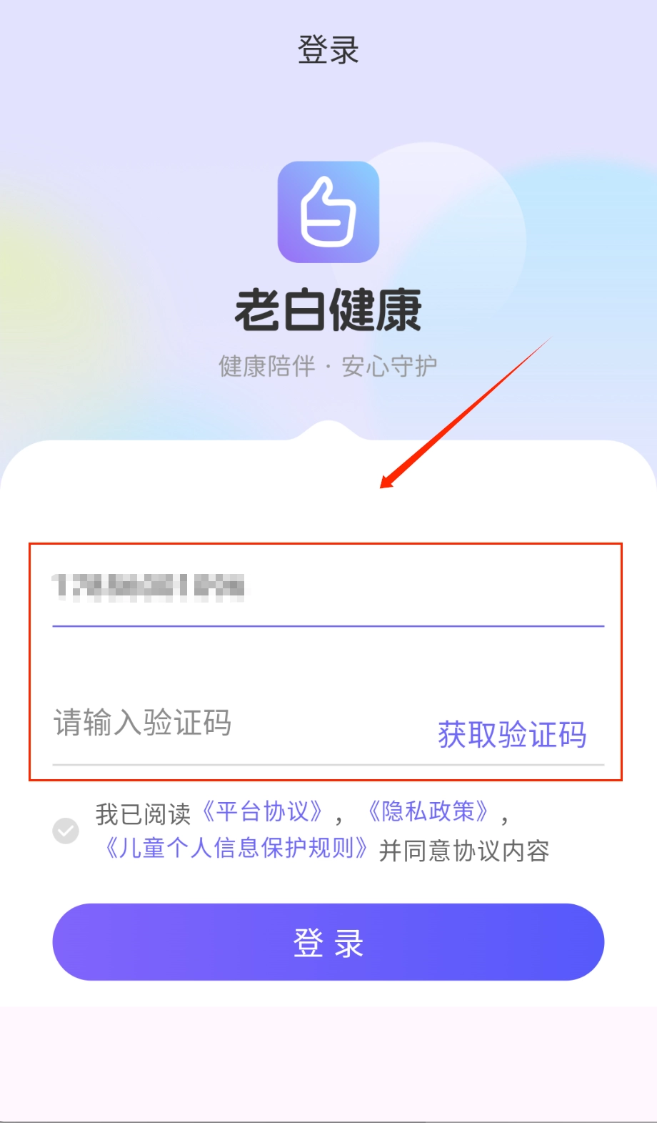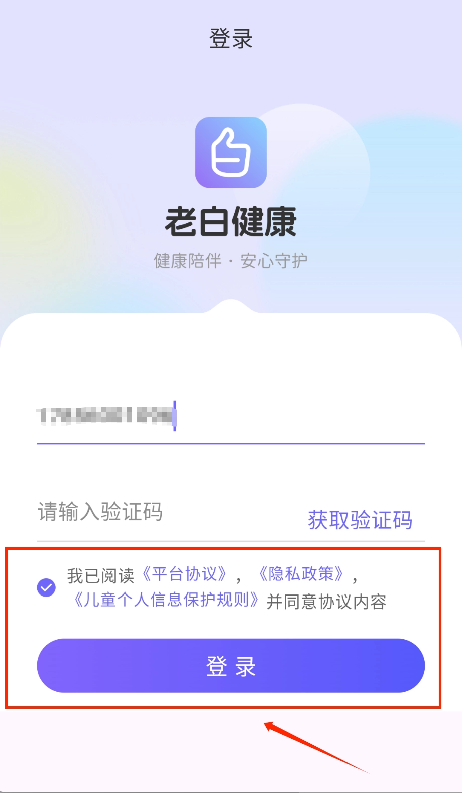 打开进入登录页面后,顶部会显示时间状态,中间位置展示着老白健康的logo以及“健康陪伴·安心守护”的标语。接着需要输入11位手机号码来获取验证码。
